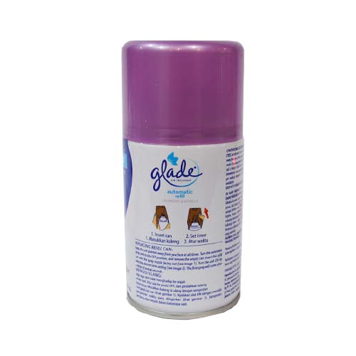 Glade Matic Spray Lavender & Vanilla Refil Pengharum Ruangan merupakan glade automatic refill yang membantu menghilangkan bau dengan isi yang bertahan hingga 60 hari. Cara isi ulang : Masukan isi ulang menurut petunjuk produsen alat, jaga agar alat tidak menghadap ke wajah setiap saat, mengatur alat ke posisi off, dan memindahkan kaleng kosongnya. Masukkan isi ulang dengan semprotan menghadap ke luar. Nyalakan alat ke On dengan memilih pengaturan waktu yang diinginkan. Semprotan pertama akan terjadi dalam beberapa saat. Mengandung bahan aktif : Parfum Lavender Vanilla 2,75%.