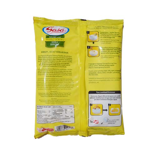 Sasa Tepung Goreng Pisang Vanilla merupakan tepung goreng pisang yang memiliki rasa dan aroma vanila sehingga tidak perlu bumbu tambahan serta menghasilkan gorengan yang renyah & gurih. Cocok untuk pisang, tape, ubi, apel, singkong, cempedak, sukun, talas, nangka, gandasturi, dan lainnya. Praktis dan lezat, serta sudah lengkap dengan telur.