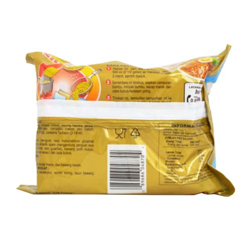 Tepung terigu, minyak nabati, tepung tapioka, garam, pengatur keasaman, penstabil, antioksidan (TBHQ), pewarna tartrazin CI 19140. BUMBU: Garam, gula, penguat rasa (mononatrium glutamat, dinatrium inosinat dan guanilat), perisa identik alami ayam , bubuk bawang merah, bubuk bawang putih, bubuk lada. BUBUK CABE, MINYAK BUMBU: Minyak nabati dan bawang merah. BAHAN PELENGKAP: Sayuran kering.