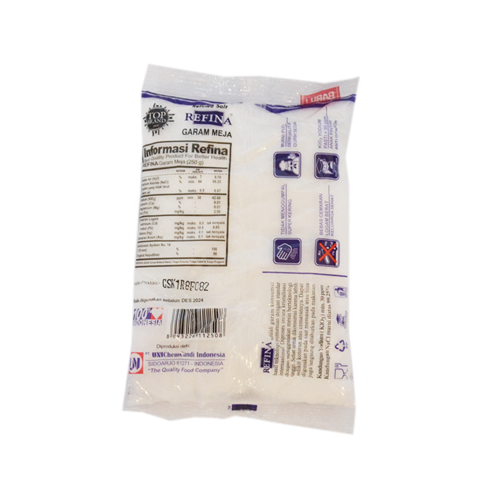 Refina garam meja murni halus beryodium 100% dari laut Indonesia hasil teknologi pemurnian berstandar internasional.