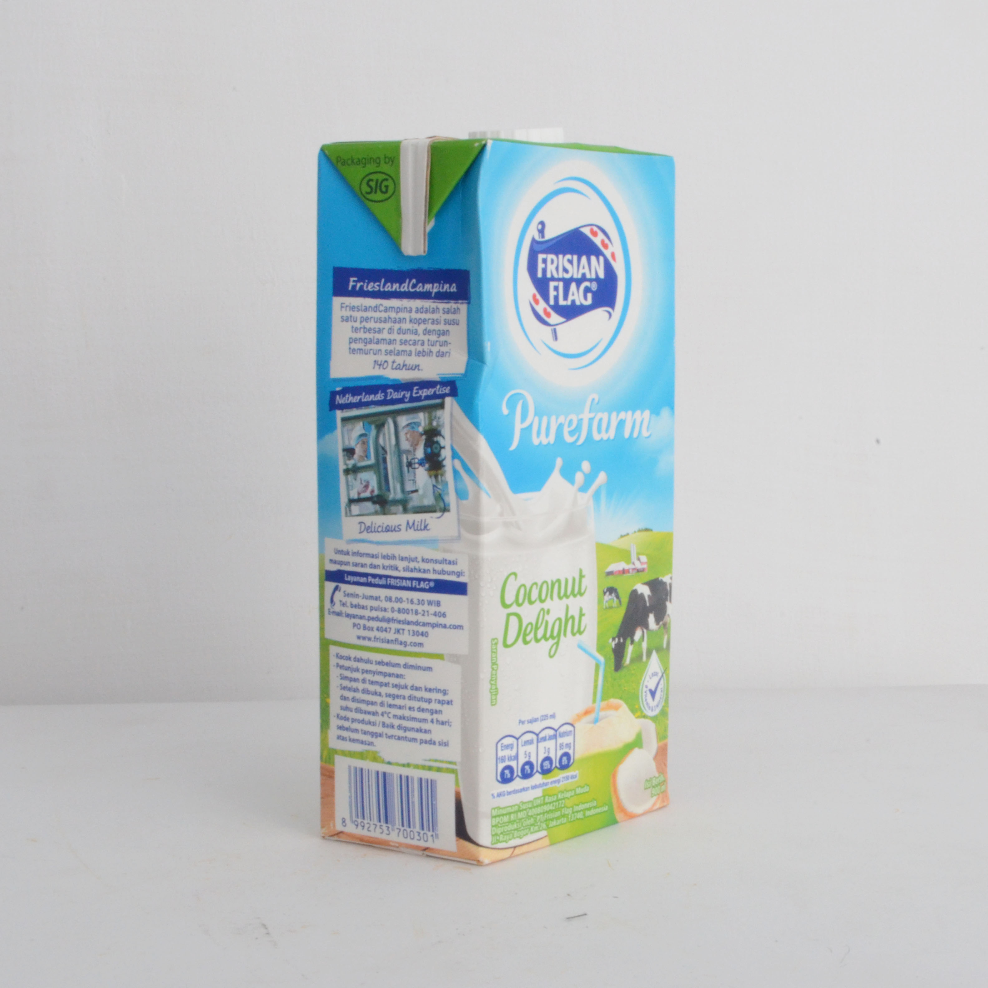 Susu Siap Minum Frisian Flag Purefarm Coconut Delight/Kelapa Muda diproduksi dengan susu segar dengan kandungan zat gizi makro (protein, karbohidrat dan lemak) dan sumber 7 Vitamin (Vitamin A, D3, B1, B2, B3, B6 dan B12), dan vitamin B5 serta sumber 3 mineral (Kalsium, Fosfor dan Yodium) dan Natrium dan Kalium. Frisian Flag Purefarm Coconut Delight adalah satu-satunya susu dengan rasa kelapa muda yang segar. Minum susu dengan sensasi rasa berbeda akan Anda temukan di Frisian Flag Purefarm Coconut Delight.