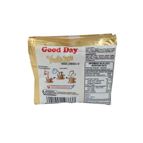 Kemewahan rasa kopi dan aroma vanilla dalam Good Day Vanilla Latte, memgakrabkan suasana dan bikin ketagihan. Tidak masalah! Memang begitu asyiknya persahabatan dengan kehangatan Good Day Vanilla Latte.