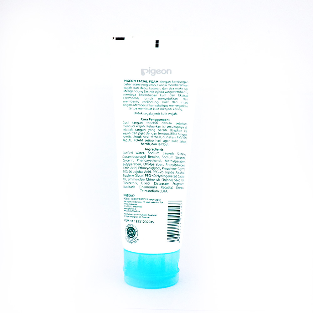 Pigeon Facial Foam dengan kandungan bahan alami yang lembut untuk membersihkan wajah dari debu, kotoran dan sisa make up. Mengandung ekstrak jojoba yang membantumenjaga kelembaba kulit dan ekstrak chamomile untuk menyejukkan dan membantu melindungi kulit dari iritasi ringan. Membersihkan sekaligus menyegarkan tanpa membuat kulit menjadi kering. Untuk segala jenis kulit.