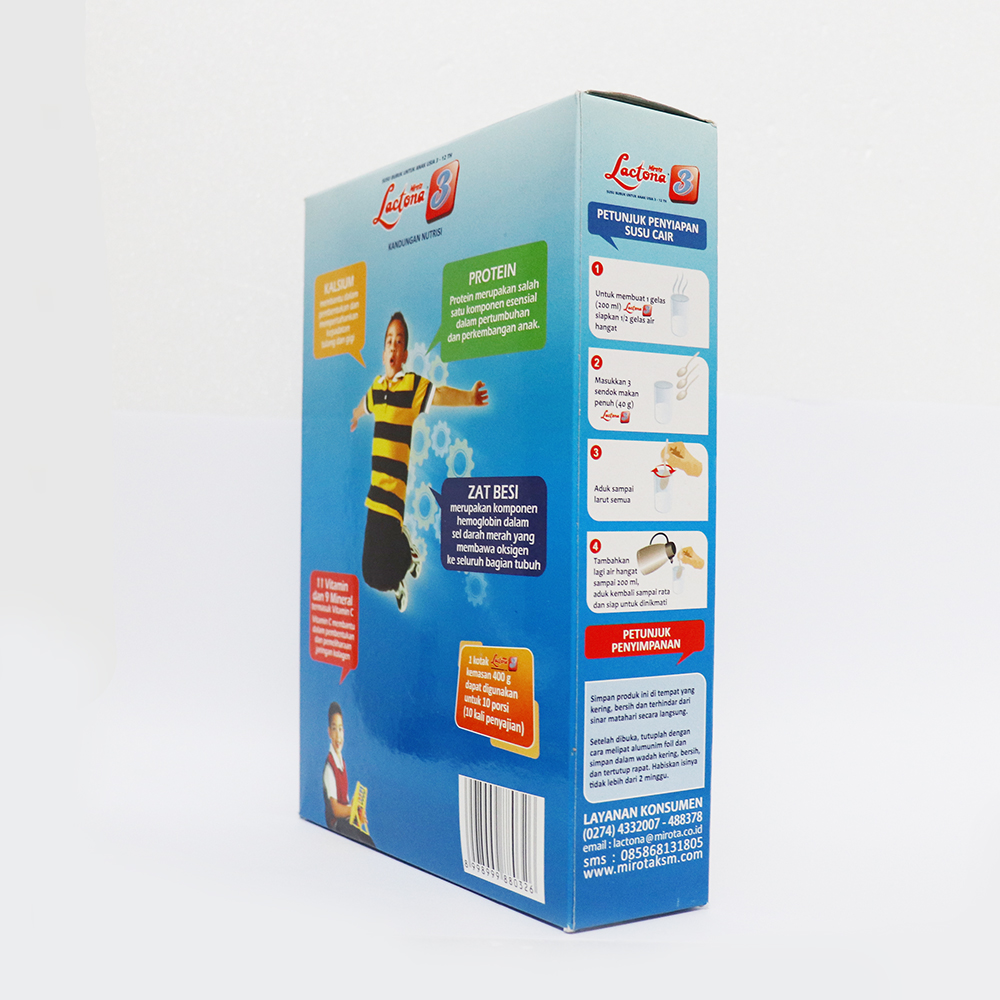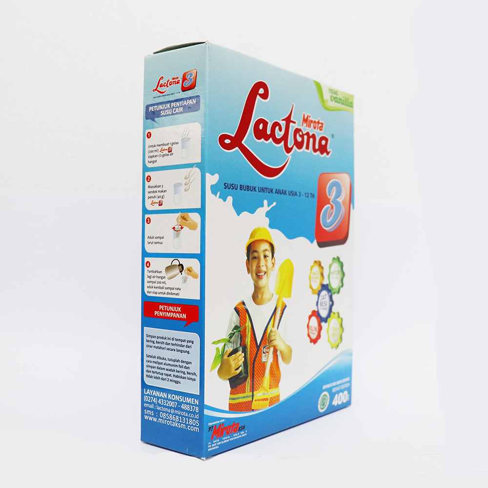 Lactona 3 merupakan susu pertumbuhan untuk anak anak usia 3 - 12 tahun. Lactona 3 dilengkapi dengan omega 3, 6 dan 9 merupakan asam lemak esensial yang sangat dibutuhkan tubuh untuk perkembangan otak yang optimal. Diperkaya dengan Kolin dan berbagai asam Amino esensial serta AA dapat membantu mempercepat penyampaian rangsangan impuls syaraf pad aotak. lactona 3 tinggi KALSIUM SUSU agar anak tumbuh tinggi, FOSFOS untuk memperkuat tulang dan giginya.