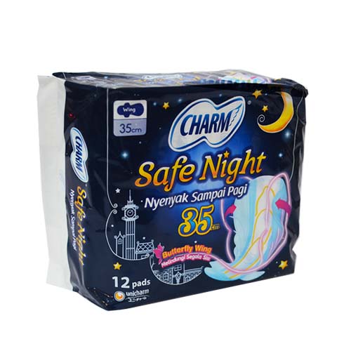 Charm Safe Night 35 Cm memiliki panjang hingga ke bagian belakang. Memberikan perlindungan maksimal anti bocor. Memiliki area serap 35 cm sehingga nyaman di gunakan pada saat tidur.